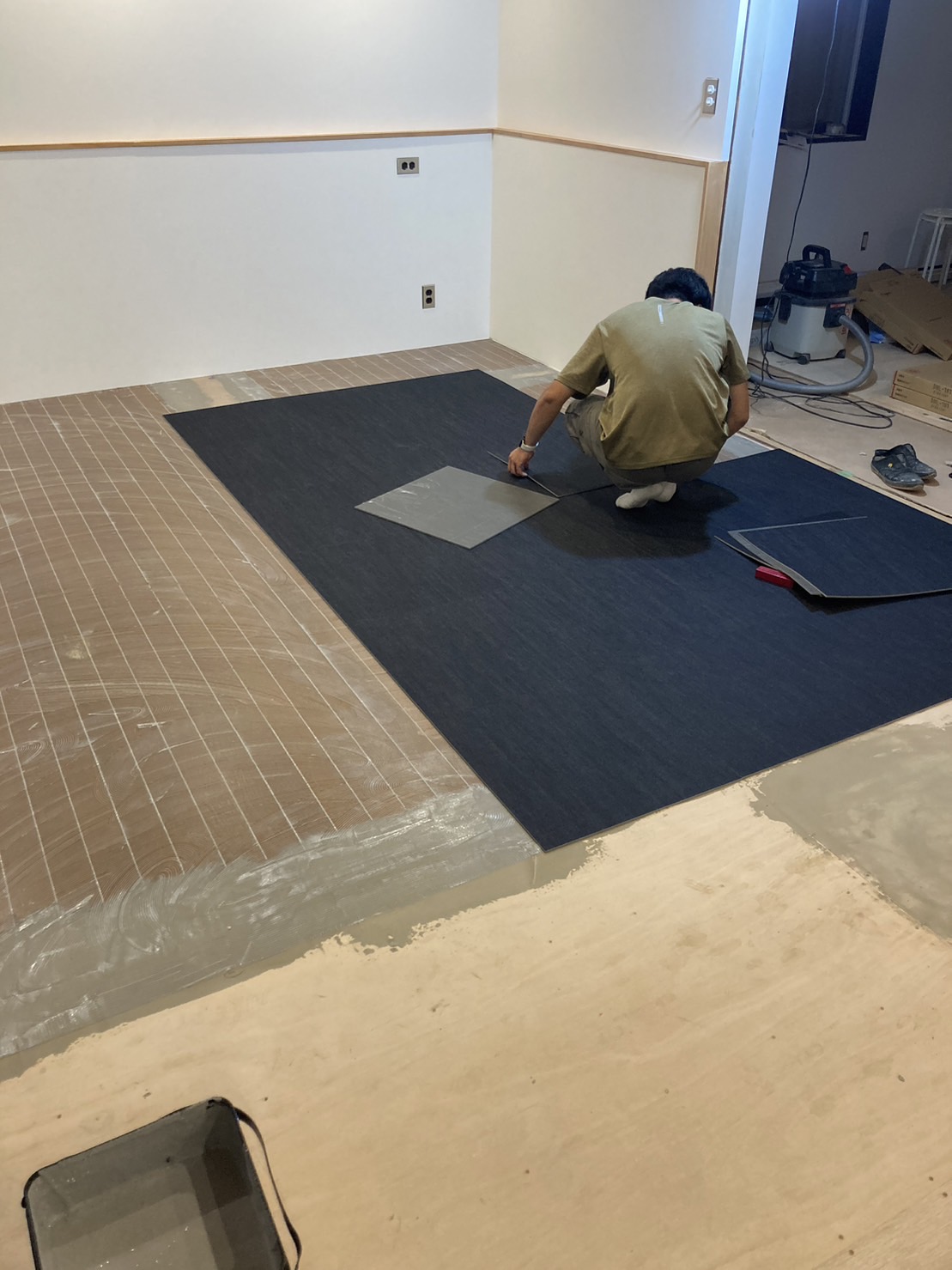 こだわりポイントは床に敷いたタイルカーペットはデニム生地でできており